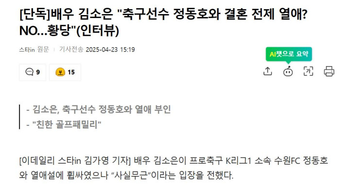 此外,有消息称前足球选手许范山是两人的“牵线人”,金素恩则澄清:“许范山是我认识15年的老朋友,我们和郑东浩都是高尔夫球友,经常一起打球。”她表示,三人因共同爱好而熟识,但外界因此误传恋爱消息,让她感到无奈。
